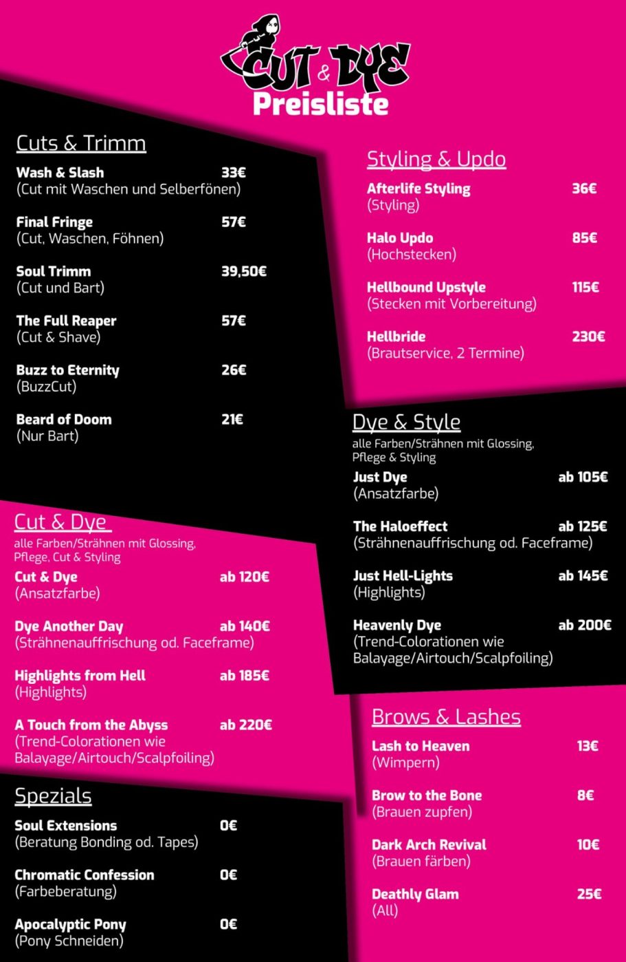 Im Cut and Dye Menü findest du alles von minimalistischen Kurzhaarschnitten über individuelle Farbkonzepte bis hin zu Brauen- und Wimpernservices. Die Namen meiner Dienstleistungen dürfen spielerisch sein – dahinter steckt immer eine klare fachliche Leistung, die ich dir auf Wunsch genau erkläre.